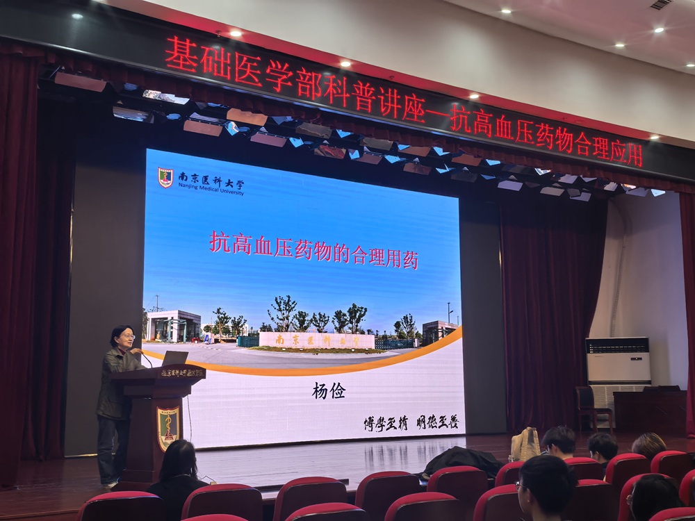 为提高师生及公众对高血压科学防治的认知,普及规范用药知识,基础医学部于11月13日在医政楼报告厅举办“抗高血压药物的合理应用”主题科普讲座。本次讲座邀请南京医科大学博士生导师、知名药学专家杨俭教授担任主讲,吸引了基础医学部众多师生积极参与。