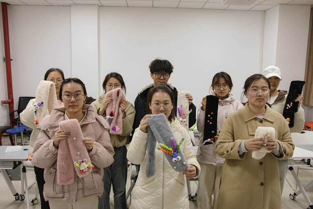 活动以“创意织暖”为主线,设置了材料领取、自由创作、作品展示与情感分享等环节。活动伊始,同学们领取编织围巾的材料包,并围绕创作灵感进行轻松交流;随后大家专注投入围巾编织,以一针一线细细织就温暖与关怀;在分享环节,同学们积极展示各自作品,讲述创作背后的情感故事,在交流中凝聚共鸣、传递真挚情谊。最后,活动在集体合影与自由交流中圆满落下帷幕。